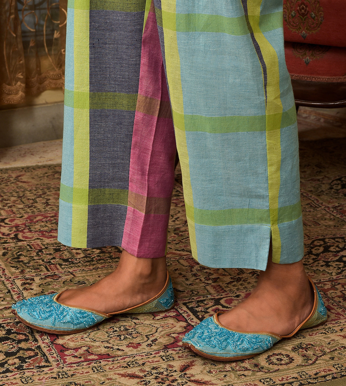 Elevate your everyday elegance with this straight-cut kurta and pant set, crafted from premium handwoven cotton. The kurta features a soft ivory base adorned with intricate blue geometric embroidery along the neckline, shoulders, and sleeves. The deep V-collar with a structured overlap adds a contemporary edge to this ethnic silhouette. Paired with checkered colorblock pants that bring subtle contrast and modern flair, this set offers a balance between comfort and refined aesthetics. Ideal for workwear, casual outings, or light festive occasions, it adds a unique charm to your wardrobe.