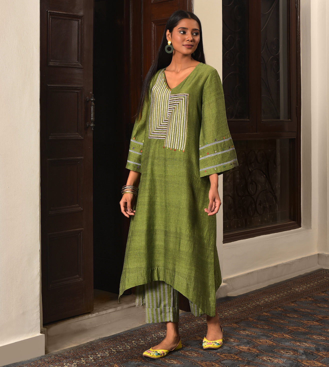 Elevate your everyday style with this striking olive green kurta and pant set crafted from breathable handwoven cotton. The kurta features a flattering V-neckline highlighted by intricate geometric thread embroidery and subtle bead embellishments that add just the right touch of elegance. The linear detailing on the sleeves and inner placket lining adds visual interest, while side slits offer ease of movement.