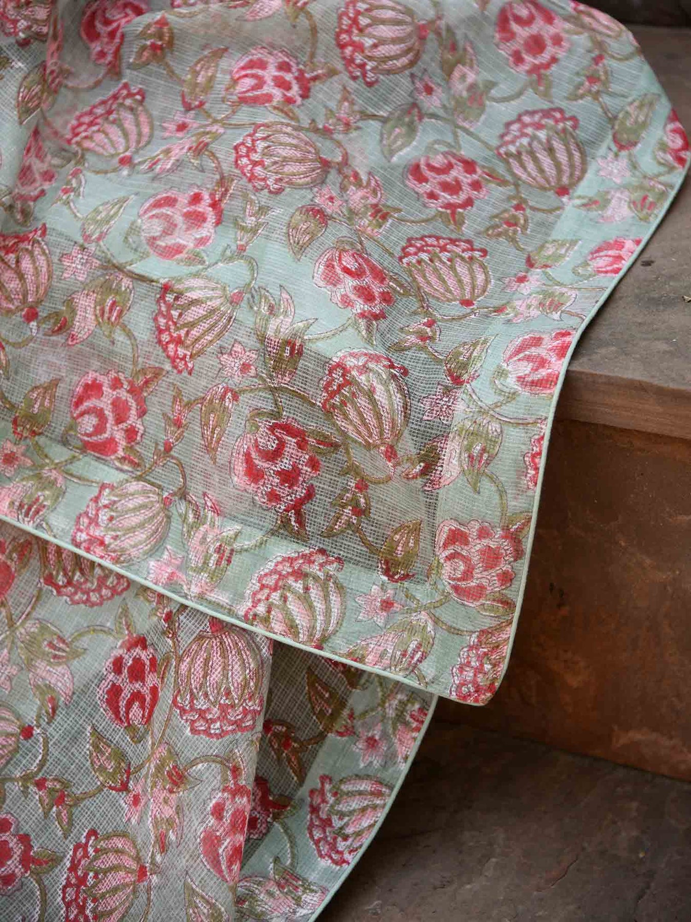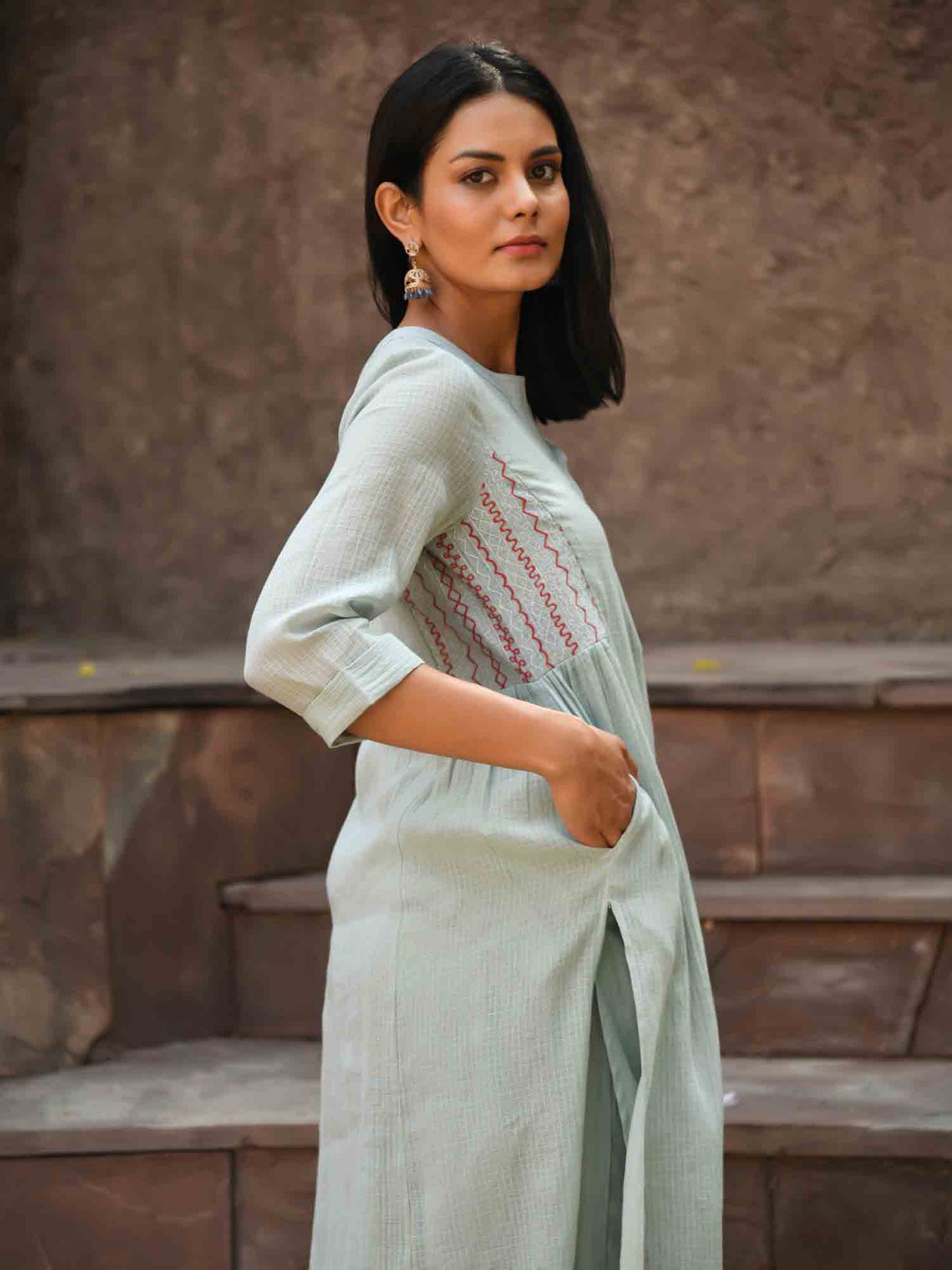 Light green Kota cotton kurta with thread detailing on the sides under the sleeves. Put together with a pink and green printed kota dupatta. A healing kurta pant dupatta set that is going to keep you in a happy space.