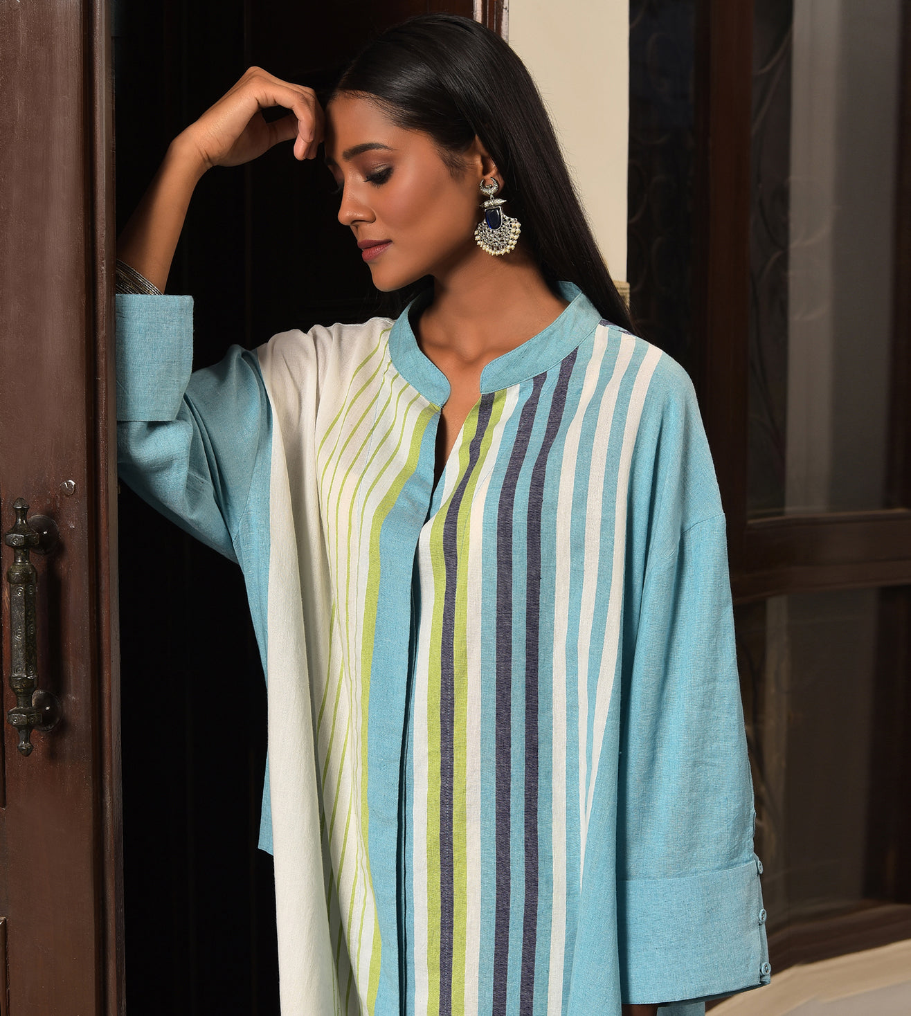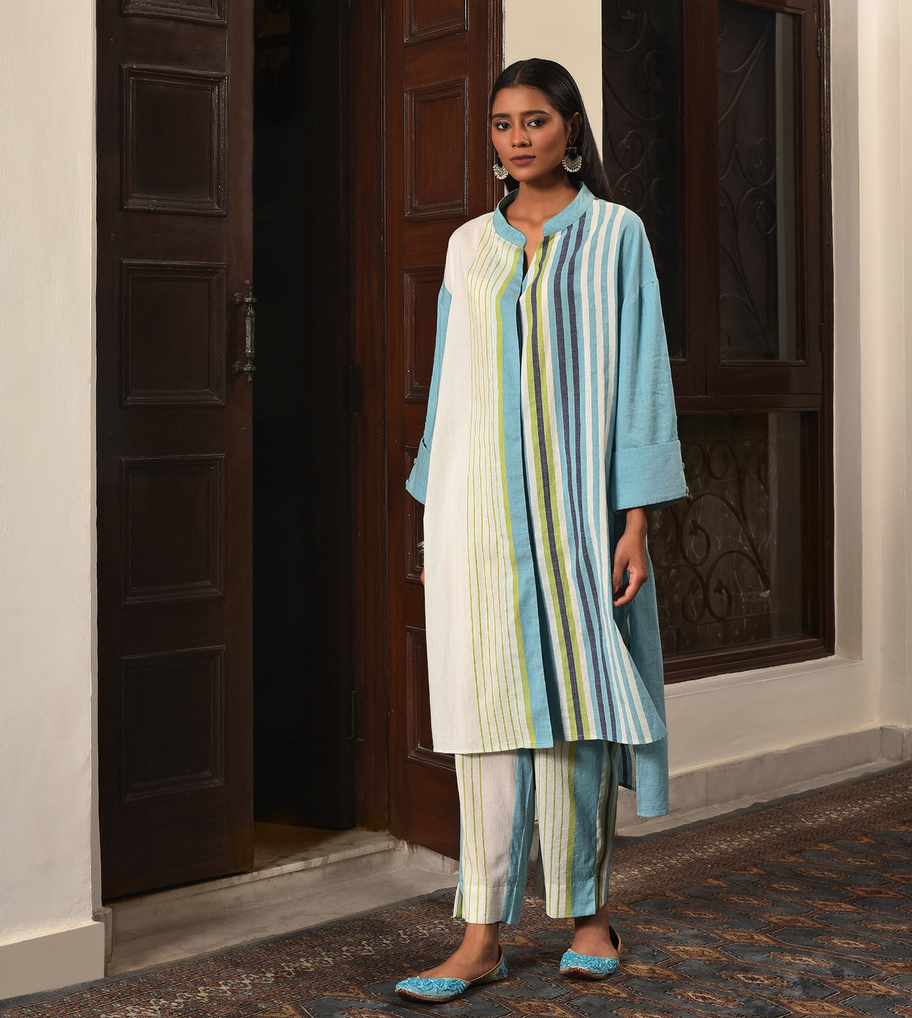 Stay effortlessly stylish and comfortable with this chic striped kurta set crafted in premium handwoven cotton. The kurta features a soothing palette of soft blue, ivory, olive, and navy vertical stripes, creating a refined yet playful look. The front placket and stand collar enhance the modern, structured feel, while the relaxed silhouette ensures ease of movement. Paired with a matching solid or subtly striped handwoven pant, this set is perfect for daywear, office looks, or relaxed outings that call for understated elegance.