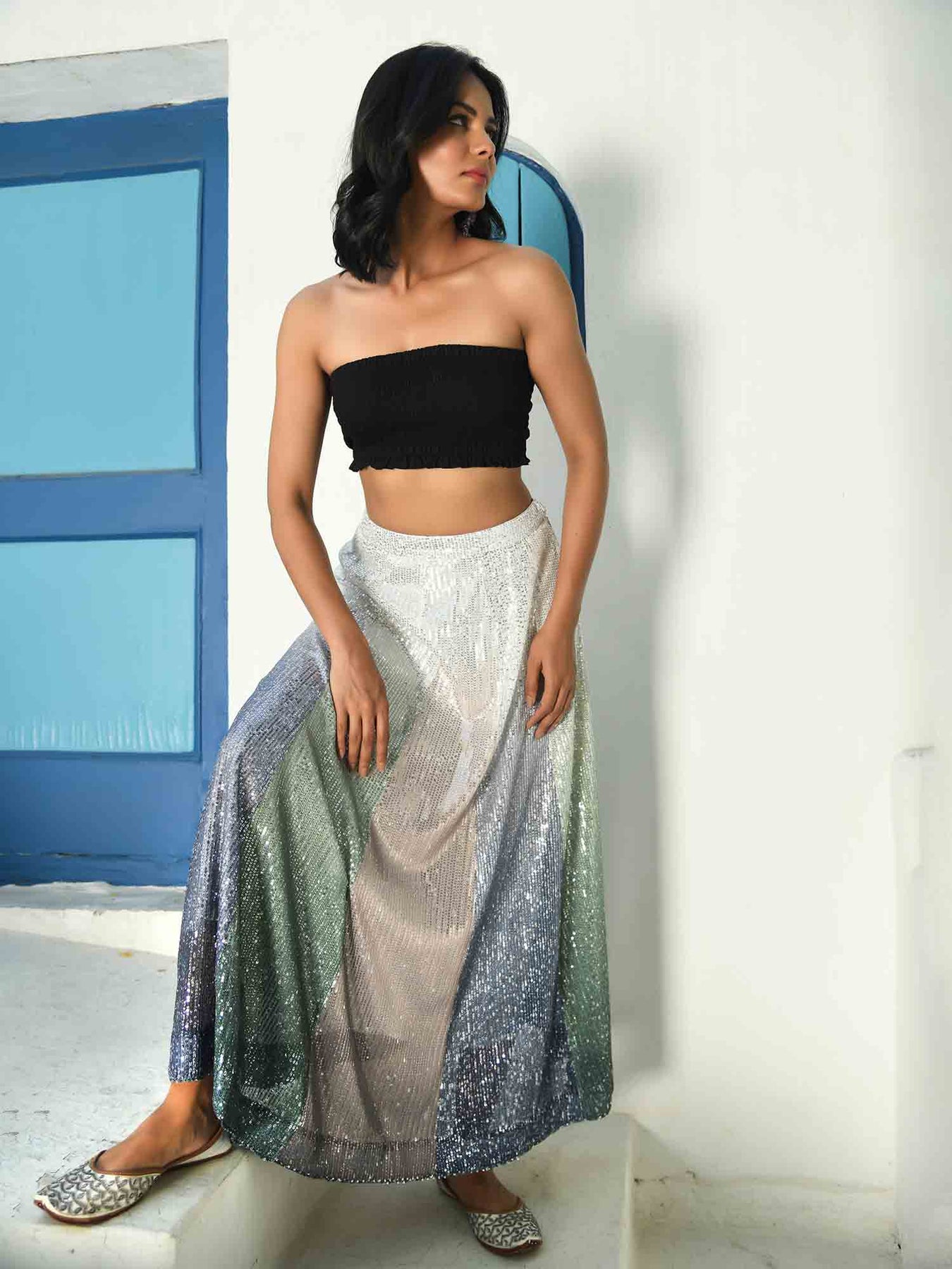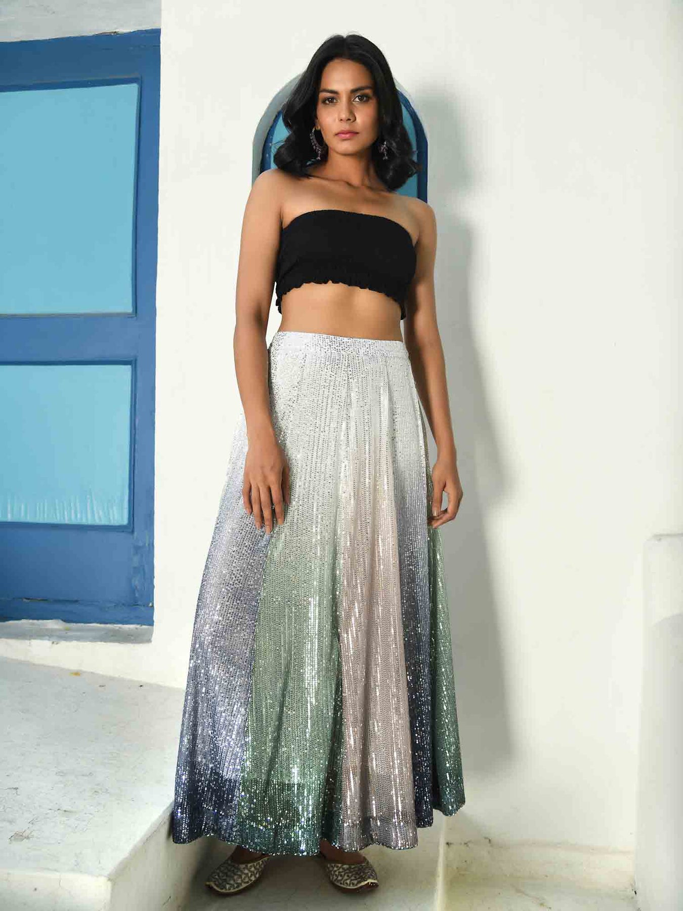 Our new bling version of the panelled skirt in sober colours of beige, green and grey ombre sequence fabric. A very beautiful piece that can be worn traditionally or as a modern evening wear. Choose your bling!